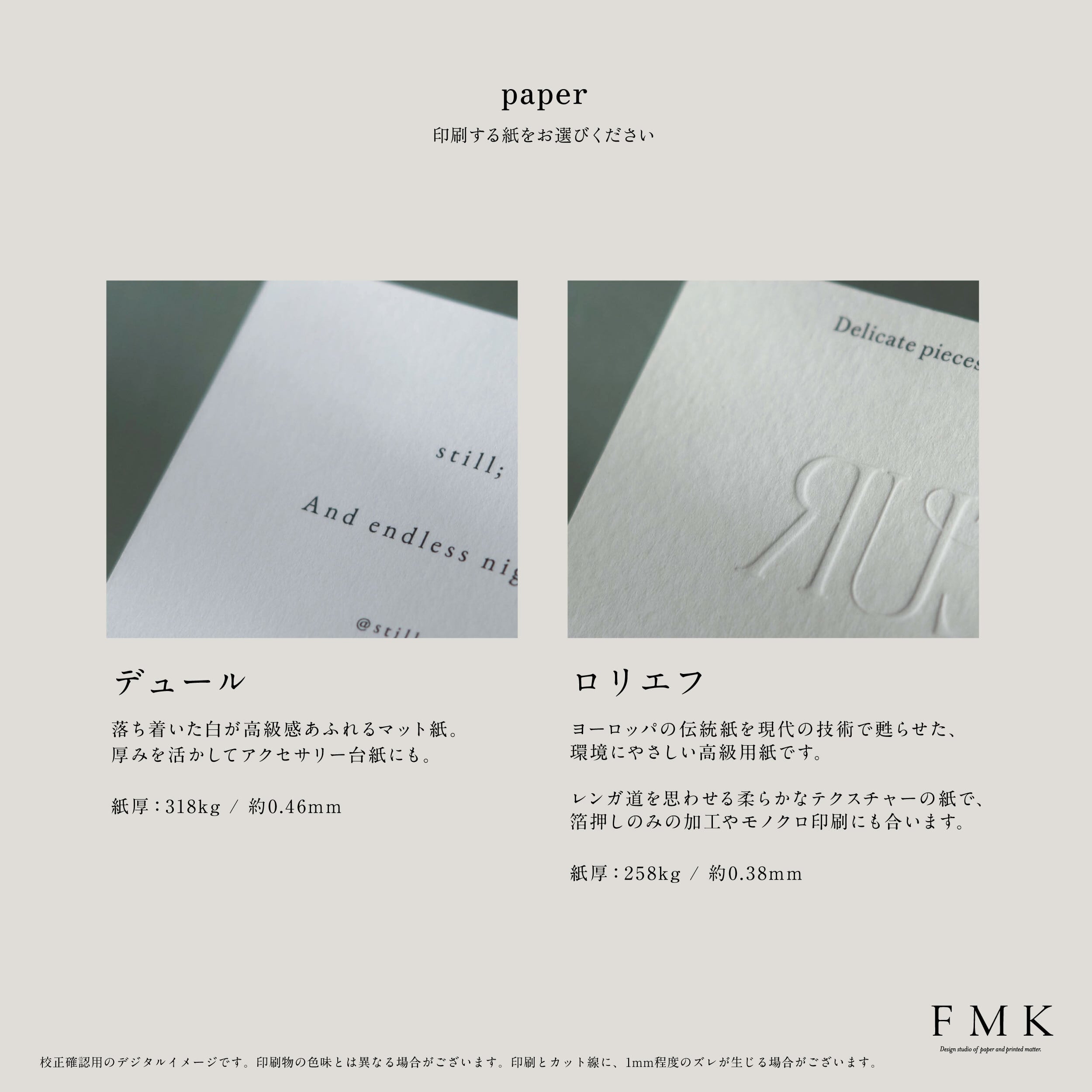 物語を語るように配置された、上質なレイアウト「Verse」。 右側のコンセプト文が世界観を伝え、 左下のショップ名をエンボス加工で際立たせます。 ブランドの想いを言葉に乗せて届けたい方におすすめです。 裏面にお名前を入れて名刺としてもお作りいただけます。 ⸻ ご注文の流れ 1. カラー・フォント・スタイル・紙を選び、ご購入ください。 2. FMK公式LINEを登録し、「ショップ名・コンセプト文やInstagramなど記載内容」をお送りください。 LINE登録はこちら ☞ https://lin.ee/2aaYs6E 3. 数日以内にLINEでデザイン確認をお送りします。 ※修正回数2回まで料金内に含まれます。3回目以降は修正1回1,650円となります。 4. 校了後、印刷を開始いたします。 5. 校了後、約2週間前後で完成品をお届けします。 ⸻ 対応サイズ ・名刺サイズ(91×55mm) 上記サイズ以外をご希望の方はLINEにご相談ください。 ⸻ Canvaデータ入稿も可能です Canvaなどで作成したデザインをPDF形式でご入稿ください。 LINEからデータ送信も可能なので、初めての方でも安心してご利用いただけます。 ⸻