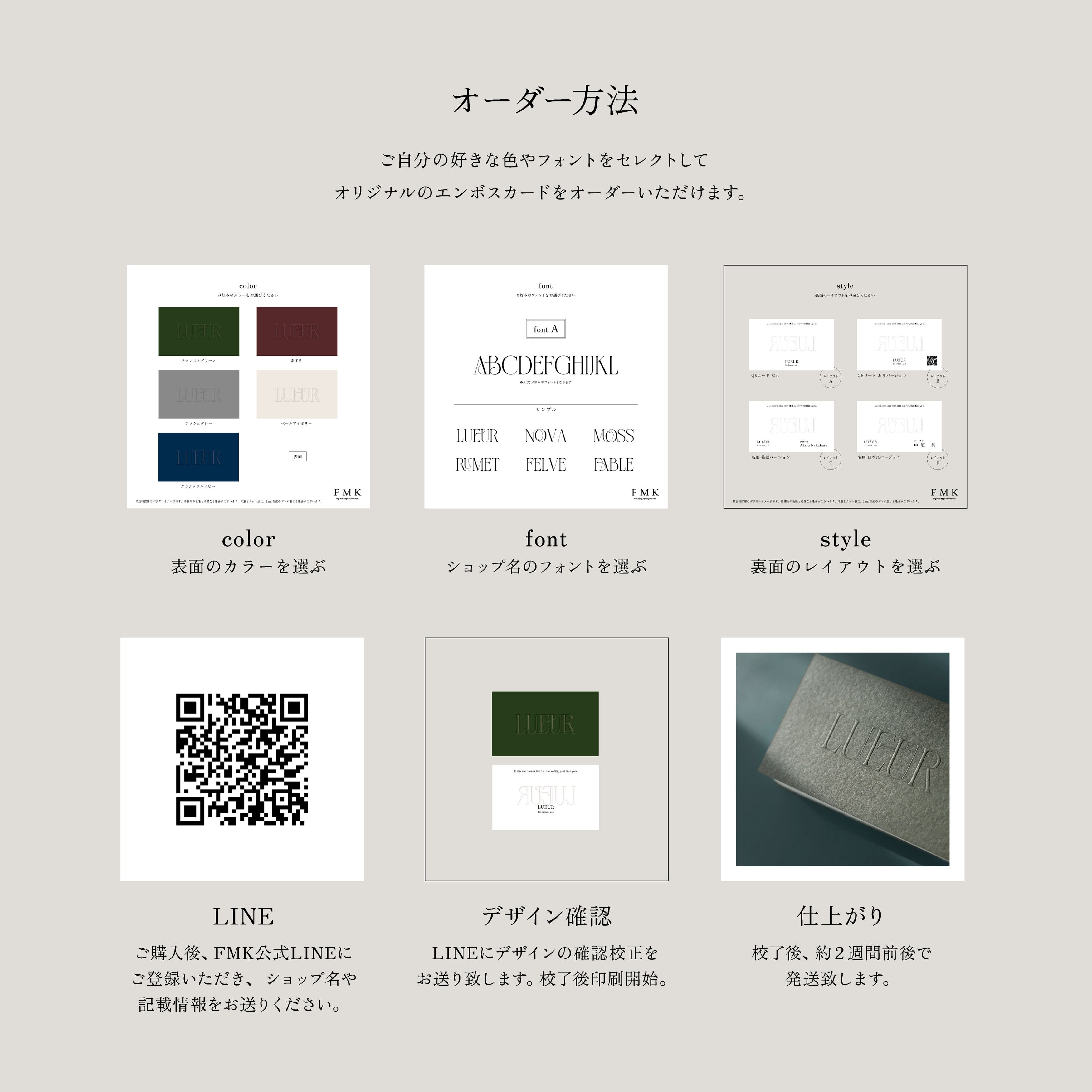 優雅さと洗練を纏うレイアウト「Grace」。 流れるような書体と繊細な配置が、 ブランドの気品とストーリーを際立たせます。 裏面にもこだわりを込め、 エレガントな世界観を余すことなく表現します。 表面のブランドロゴはエンボス加工で仕上げ。 ショップカードとしてはもちろん、 お名前を入れて名刺としてもお作りいただけます。 ⸻ ご注文の流れ 1. カラー・フォント・スタイル・紙を選び、ご購入ください。 2. FMK公式LINEを登録し、「ショップ名・コンセプト文やInstagramなど記載内容」をお送りください。 LINE登録はこちら ☞ https://lin.ee/2aaYs6E 3. 数日以内にLINEでデザイン確認をお送りします。 ※修正回数2回まで料金内に含まれます。3回目以降は修正1回1,650円となります。 4. 校了後、印刷を開始いたします。 5. 校了後、約2週間前後で完成品をお届けします。 ⸻ 対応サイズ ・名刺サイズ(91×55mm) 上記サイズ以外をご希望の方はLINEにご相談ください。 ⸻ Canvaデータ入稿も可能です Canvaなどで作成したデザインをPDF形式でご入稿ください。 LINEからデータ送信も可能なので、初めての方でも安心してご利用いただけます。 ⸻